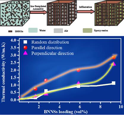 针对传统的聚合物基电子封装材料的导热性差的问题,该团队通过定向冷冻技术现实导热填料的定向排列,构筑三维导热网络,并最终制备出新型结构的高导热电子封装材料。相比于传统的粒子随机分布在聚合物体系中,这种方法制备的电子封装材料由于已经形成了三维导热网络,仅需很少的添加量即可实现声子在三维空间的自有传输,继而大幅度提高电子封装材料的导热性能。该项研究成果为高性能的电子封装材料的热管理提供了一种新的方法,具有良好的应用前景。