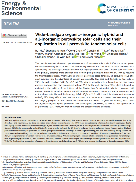 近日,我院太阳能材料与器件课题组与瑞士联邦材料科学与技术研究所(Empa)合作,全面地总结了有机无机杂化宽带隙钙钛矿和全无机宽带隙钙钛矿及其在全钙钛矿叠层太阳电池中应用的研究进展,相关成果“Wide-bandgap organic–inorganic hybrid and all-inorganic perovskite solar cells and their application in all-perovskite tandem solar cells”以四川大学为第一单位发表在国际期刊Energy & Environmental Science上(IF=38.532,2021年版)。