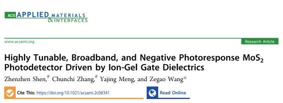 相关成果以“Highly Tunable, Broadband, and Negative Photoresponse MoS2 Photodetector Driven by Ion-Gel Gate Dielectrics” 为题发表在著名期刊《ACS Applied Materials & Interfaces》上(中科院一区,川大B刊,影响因子10.383)。四川大学材料学院2019级本科生沈桢贞、张春池为论文第一作者,王泽高特聘研究员为通讯作者,华西医院孟雅婧医生参与了该项研究。论文唯一通讯单位为四川大学材料学院。