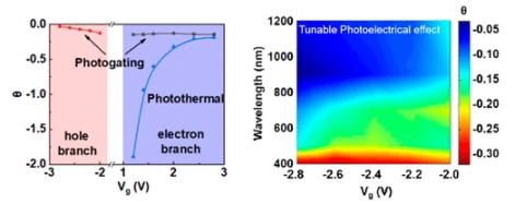 在此,研究人员利用PVDF-EMIM-TFSI作为凝胶电介质,制备了一种基于二硫化钼的离子凝胶晶体管。通过调节栅极电压,二硫化钼表现出双极性电特性,并在此基础上研究电子、空穴载流子的光电效应。发现二硫化钼光电晶体管在电子分支和空穴分支中都表现出反常的负光电效应。C2F6NO4S2-离子的吸附/解吸在电子分支中占主导地位,而photogating效应在空穴分支中占主导地位。通过调节栅极电压,可以调节载流子浓度,从而调节光-物质的相互作用。因此,电子分支的光响应率和探测率可达21.79 A/W和2.45×1011 Jones,空穴分支的光响应和探测率分别为7.82 A/W和1.12×1011 Jones。此外,光响应甚至可以从可见光区域延伸到近红外区域。本研究提供了外场调谐光响应,揭示了空穴/电子主导材料的研究机制,并为未来通信和可穿戴医疗保健电子器件提供了参考。