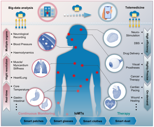 健康医疗一直在向更专业化和多样化方向发展,以满足患者的个性化需求。能够由病人操作并监测其自身健康状况的医疗电子设备或平台的出现,正在彻底改变医疗领域。其中,新兴的超声生物电子以可穿戴、可植入或高度集成的平台形式出现,兼具高分辨率、高灵敏度和便携性,可以对不同器官进行长期连续成像,实时检测病理异常,并及时提供一系列声功率治疗,远远优于传统超声电子设备的医疗工作流程。当前,材料设计、制造工艺、无线功率技术、数字通信及算法等方面的进步正在加速融合,为实现这些新兴超声生物电子作为未来成熟的医疗物联网(IoMT)系统的关键部件创造了前所未有的机会。