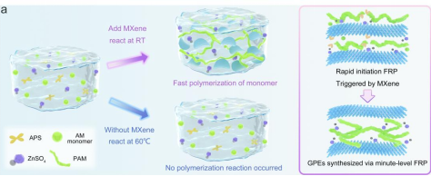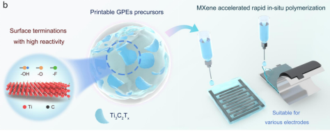 图1.(a)MXene触发化学示意图以及(b)用于打印准固态电解质示意图