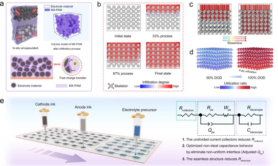 图2.(a)渗透过程及三维电极结构示意图;(b)MX-PAM电解质前驱体的渗透过程模拟;(c,d)不同渗透程度和放电深度下的电极利用效率;(e)一体式打印ZHCs的制造示意图