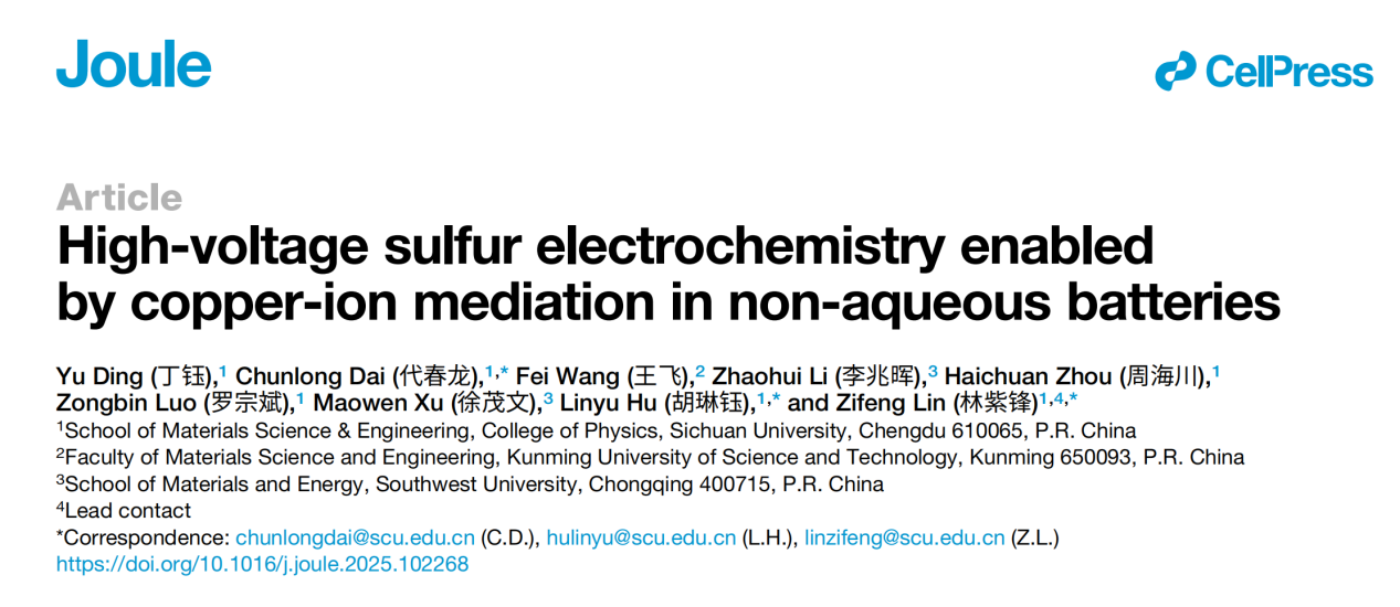 近日,我院林紫锋、代春龙团队在新型高能量密度锂铜双离子电池研究方面取得重要进展。相关研究成果以“High-voltage sulfur electrochemistry enabled by copper-ion mediation in non-aqueous batteries” 为题,发表于能源领域国际顶级期刊Joule。
