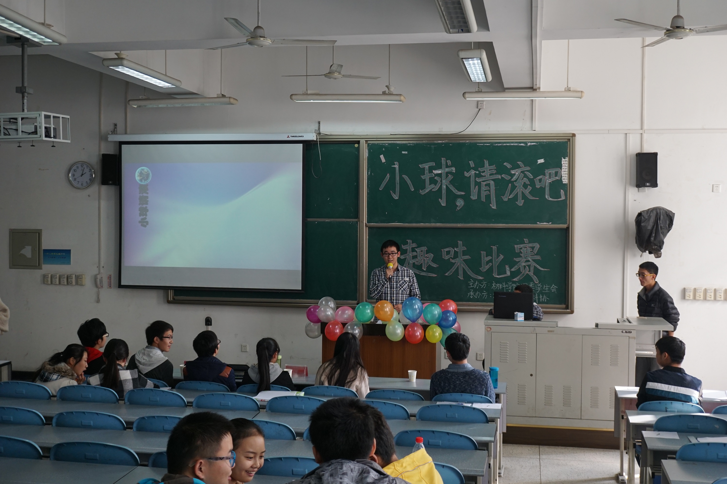 2014年11月29日下午2时,由四川大学材料科学与工程学院团委学生会主办,材料科学与工程学院学生学术科技协会承办的“小球,请滚吧”趣味性比赛在江安校区综合楼C座203教室顺利举行。担任本次比赛的嘉宾有材料学院团委副书记李依睿,材料学院团委学生会执行主席辛政,材料学院团委学生会执行副主席辛旭东及材料学院宣传部执行副部长冯腾。