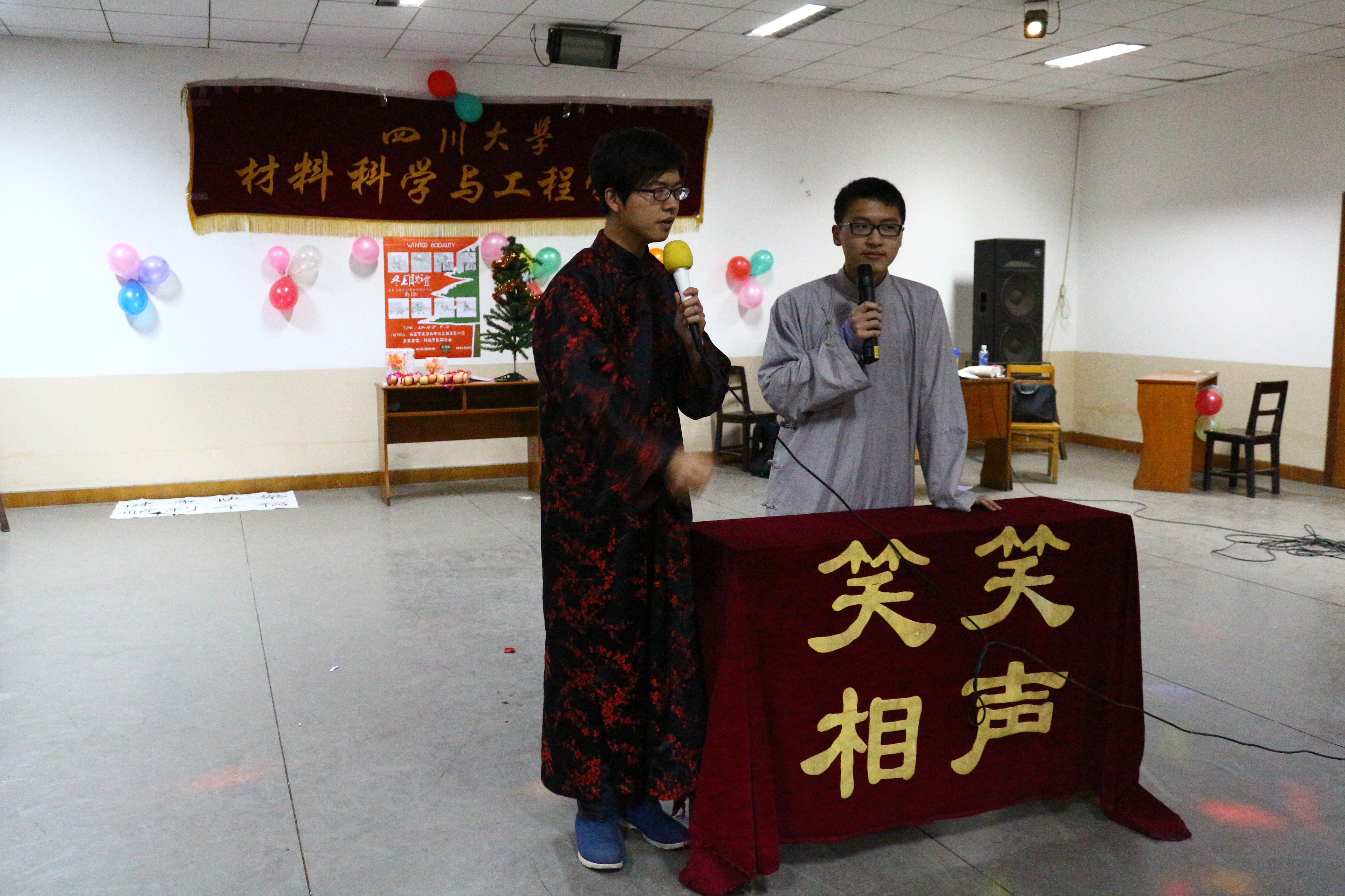 2014年12月23日晚7点,材料学院众多研究生欢聚在西区活动中心三楼文艺小厅,共度一个欢乐愉快的冬夜。大家欣赏着同学们精心准备的各种晚会节目,彼此传达着关心和祝福,共同参与到好玩的游戏中。现场气氛沸腾火热,同学们在紧张的学习和科研工作之余展示文艺才能,释放真正自我,尽显青春的活力。