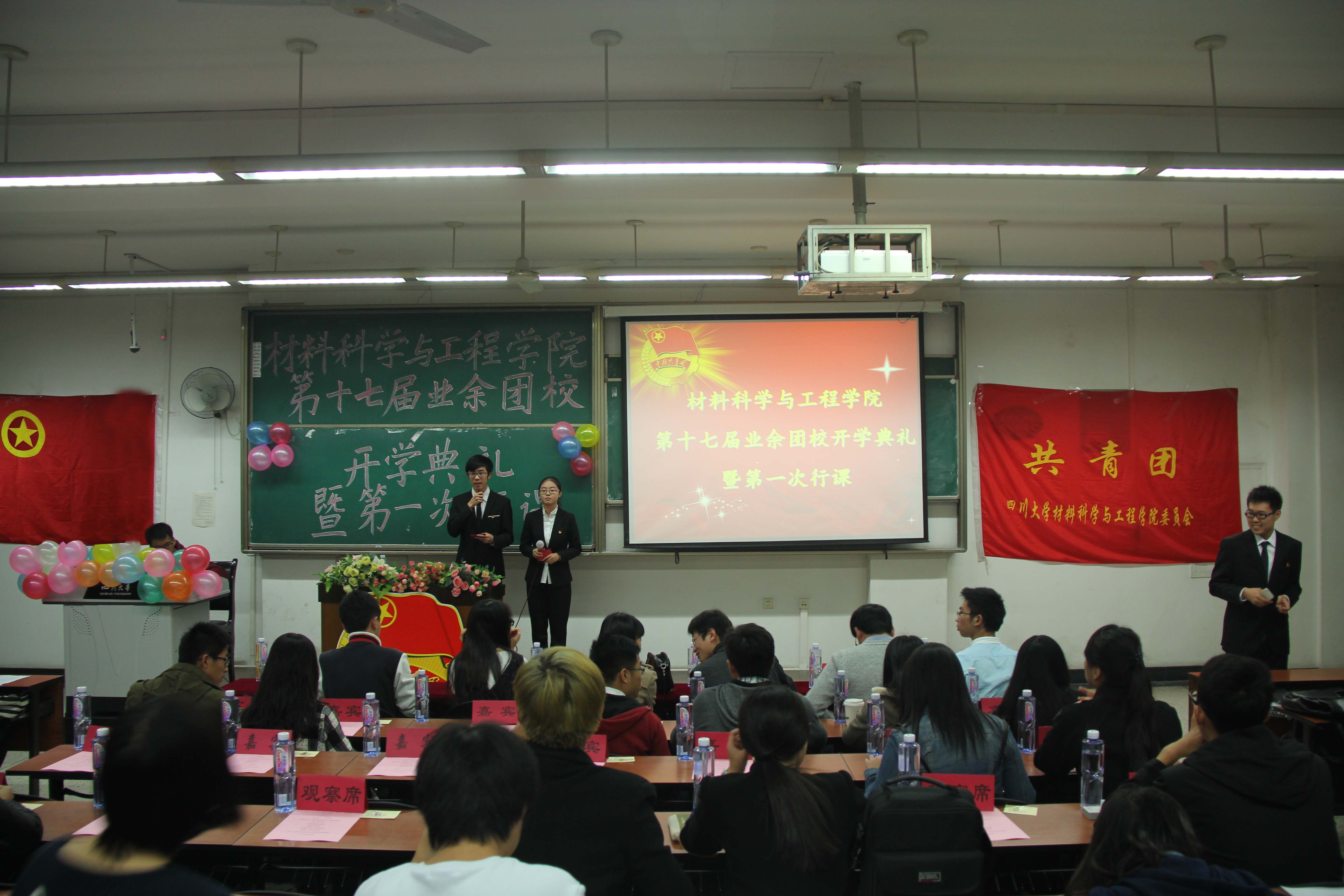11月21日19时至21时,材料科学与工程学院第十七届业余团校开学典礼暨第一次行课在江安校区第一教学楼B座301教室举行。受邀参加本次活动的嘉宾有:四川大学学生工作部江安办公室主任李佳伟老师,材料科学与工程学院团委书记王娇老师,材料科学与工程学院团委学生会主席辛政同学,材料科学与工程学院团委学生会组织部部长王慧琴同学,材料科学与工程学院团委学生会组织部副部长唐杰同学,材料科学与工程学院团委学生会权益部副部长高君正同学,材料科学与工程学院执行团委副书记黄昊龙同学,材料科学与工程学院执行团委副书记朱思佳同学,以及各兄弟学院团委副书记及组织部部长。