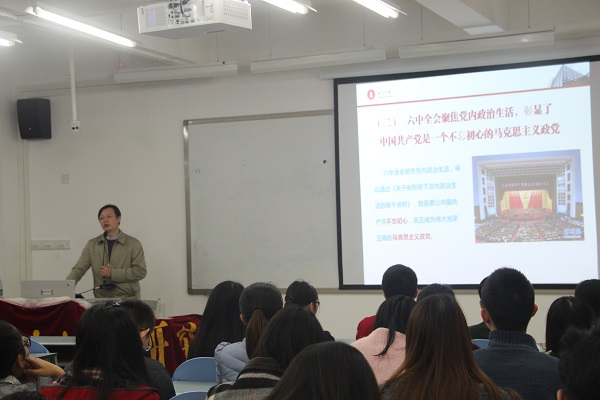 高教授以“中国共产党党的建设新的里程碑——学习贯彻党的十八届六中全会精神”为主题,与大家进行了一场别开生面的思想交流。高教授首先介绍了十八届六中全会召开的背景知识,介绍了会议的大致内容,会议审议通过的准则、条例的起草过程,并对习近平总书记作出的重要批示作了进一步讲解,从指示提出的“怎么看、怎么学、怎么做”三方面展开了此次交流。