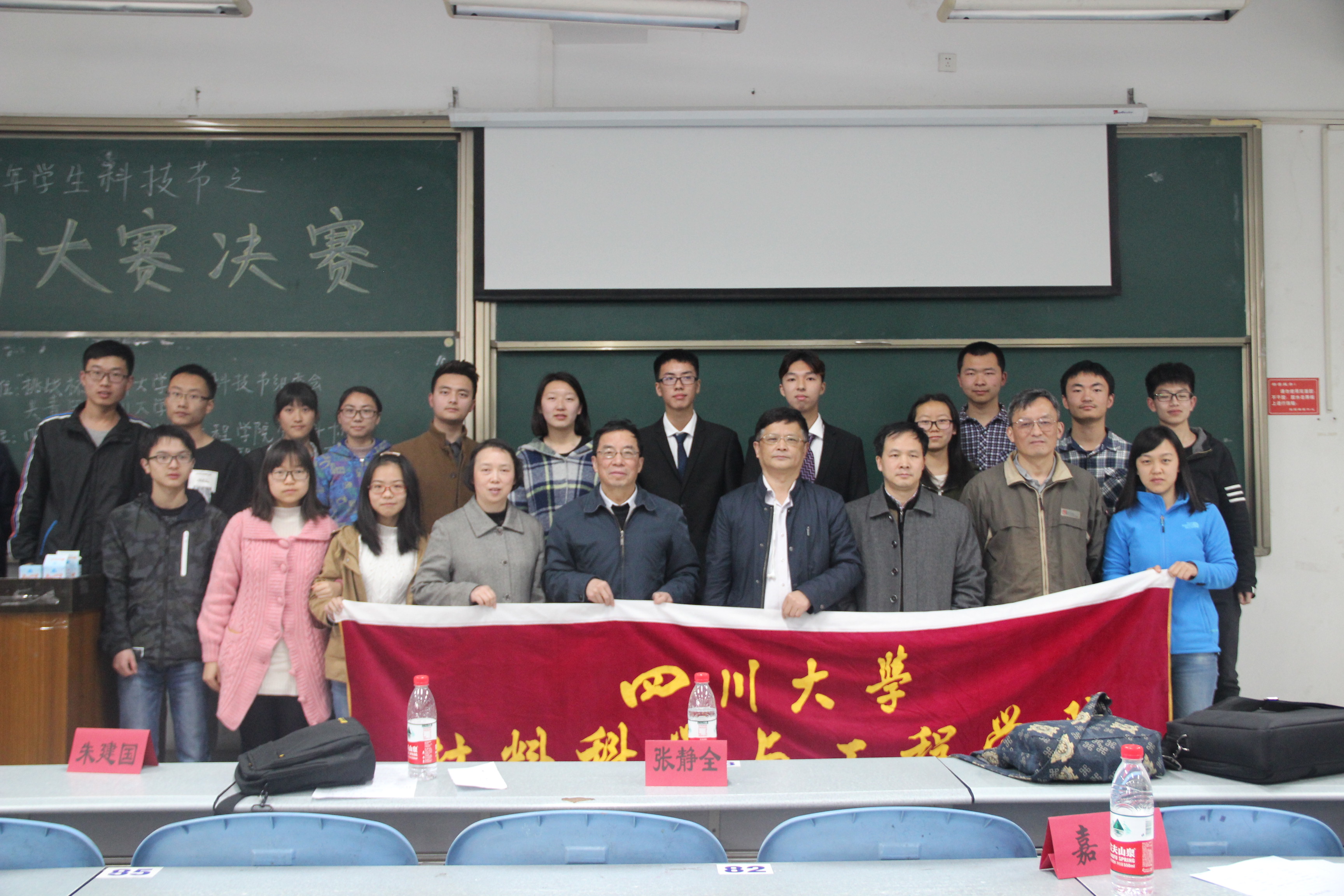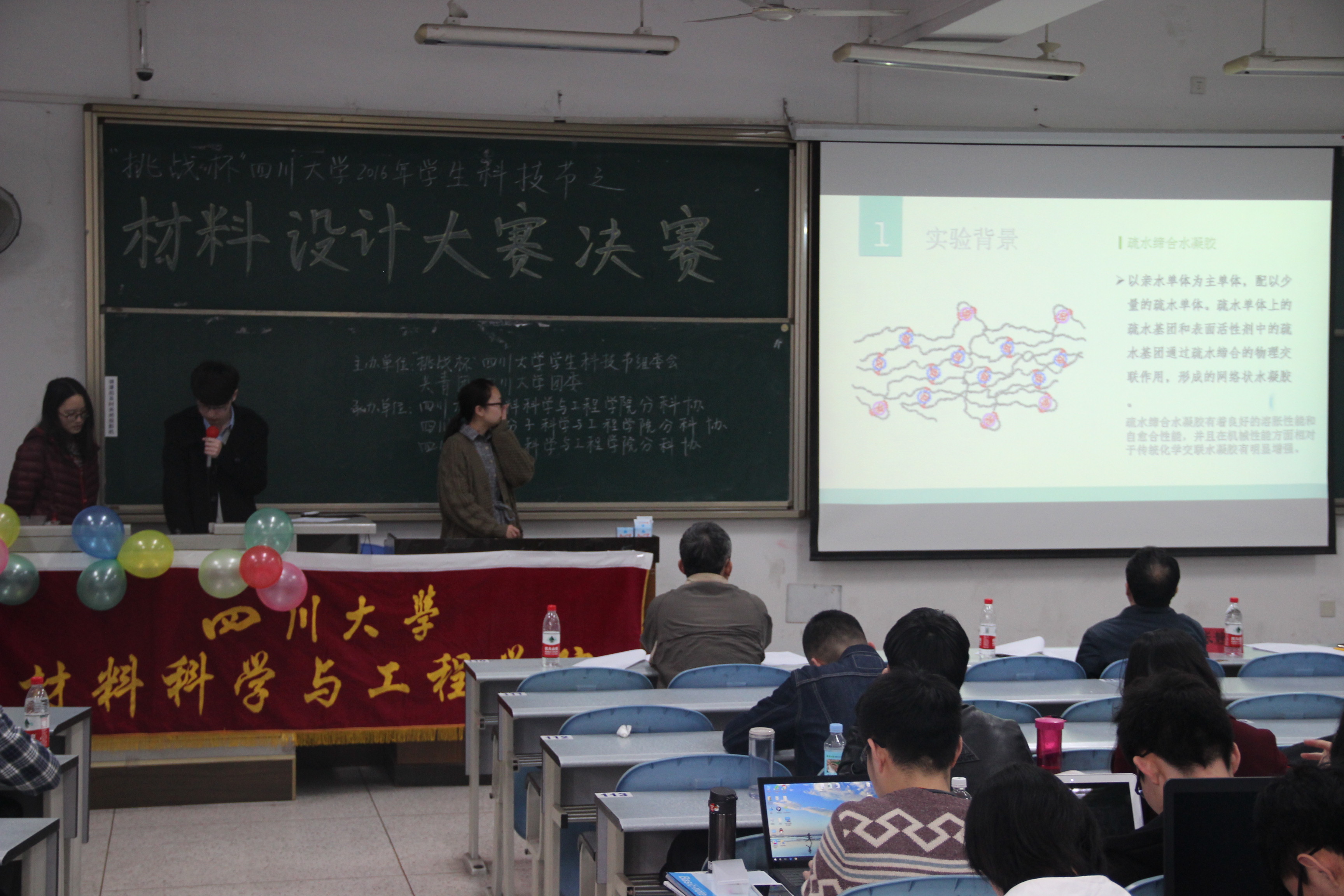 2017年3月26日,由四川大学材料科学与工程学院分团委学生学术科技协会,高分子科学与工程学院分团委学生学术科技协会和制造科学的工程学院分团委学生学术科技协会三个部门联合承办的“挑战杯”——四川大学2016学生科技节之材料设计大赛决赛在江安校区综合楼C座307教室顺利举行。大赛评委有材料科学与工程学院党委书记朱建国教授,副院长孙小松教授,无机生医系主任芶立教授,新能源材料系主任陈云贵教授,材料科学系主任张静全教授,材料科学与工程学院党委副书记唐世红老师与院分团委书记王娇老师也出席了本次大赛。材料科学与工程学院院长尹光福教授虽然未到场,但是也表示了对本次大赛顺利举行的祝愿。