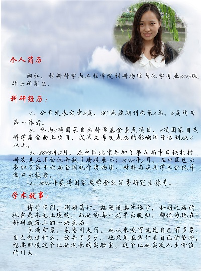 陶红同学,四川大学材料科学与工程学院硕士二年级学生,于2011年进入四川大学材料科学与工程学院材料科学系,后经免试推荐保送至本校硕士研究生,师从吴家刚教授,从事无铅压电陶瓷的性能调控及物理机理研究。她作为主要研究人员,参与了国家自然科学基金重点项目及面上项目,目前以第一作者发表论文6篇,其中SCI收录论文4篇,综合影响因子达19.0以上。同时,陶红同学获得了2016年国家奖学金及优秀研究生称号,在2015年于北京参加了第七届中日铁电材料及其应用会议并做了墙报展示,在2016年于中国包头参加了第十六届全国电介质物理、材料与应用学术会议并做了口头报告。