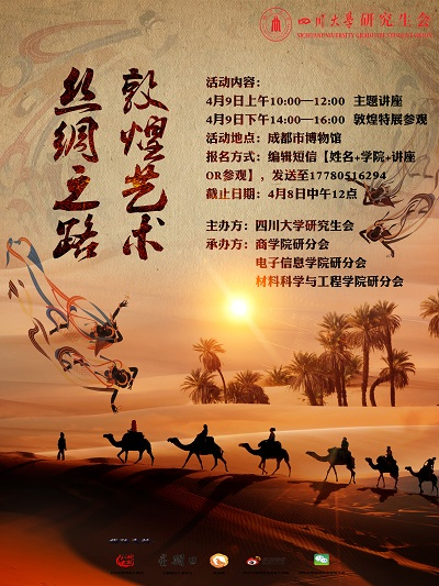 为进一步拉近川大学子与神秘敦煌文化的距离,加深同学们对博大精深的敦煌文化的了解,增强学生对中华传统文化的历史认同感,让大家更深入地了解文明交融的价值和意义所在,从而更好地向大家展示“一带一路”战略的深远影响并坚固大家对中国作为自由贸易世界桥头堡地位的信念。商学院、电子信息学院和材料科学与工程学院研分会承办的2016-2017学年第三期 “中华文化行“讲座和体验活动即将举行,主题为“丝路之魂·敦煌艺术”。