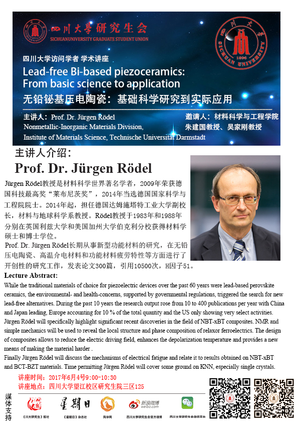 在我院朱建国、吴家刚教授的盛情邀请下,来自美国加州大学伯克利分校的Jürgen Rödel教授在百忙之中抽出时间,将于2017年6月3日至4日前来访问参观四川大学材料科学与工程学院电子陶瓷研究所,并面向全体师生作学术讲座。