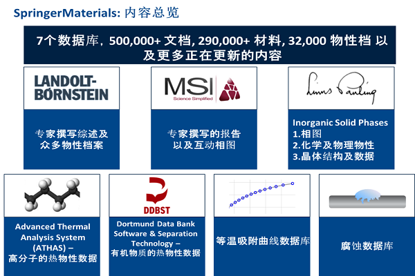 Springer Materials以Landolt-Börnstein(LB丛书系列)为基础,是全球最大的材料科学数据资源,是一个独一无二的高质量数值型数据库。Springer Materials内容涵盖物理化学和工程科学的各个领域,包含多达290,000种材料及化学体系的3,200余种特性信息。来自全球的专家负责对8000多种经同行评审的期刊原文进行审阅,经评估和筛选后,将最有效的信息收入该库,帮助广大科研人员更高效地检索和获取材料科学领域的信息和材料性质。Springer Materials每个季度都会扩充内容并做出更新,保持Springer Materials处于材料科学的最前沿。
