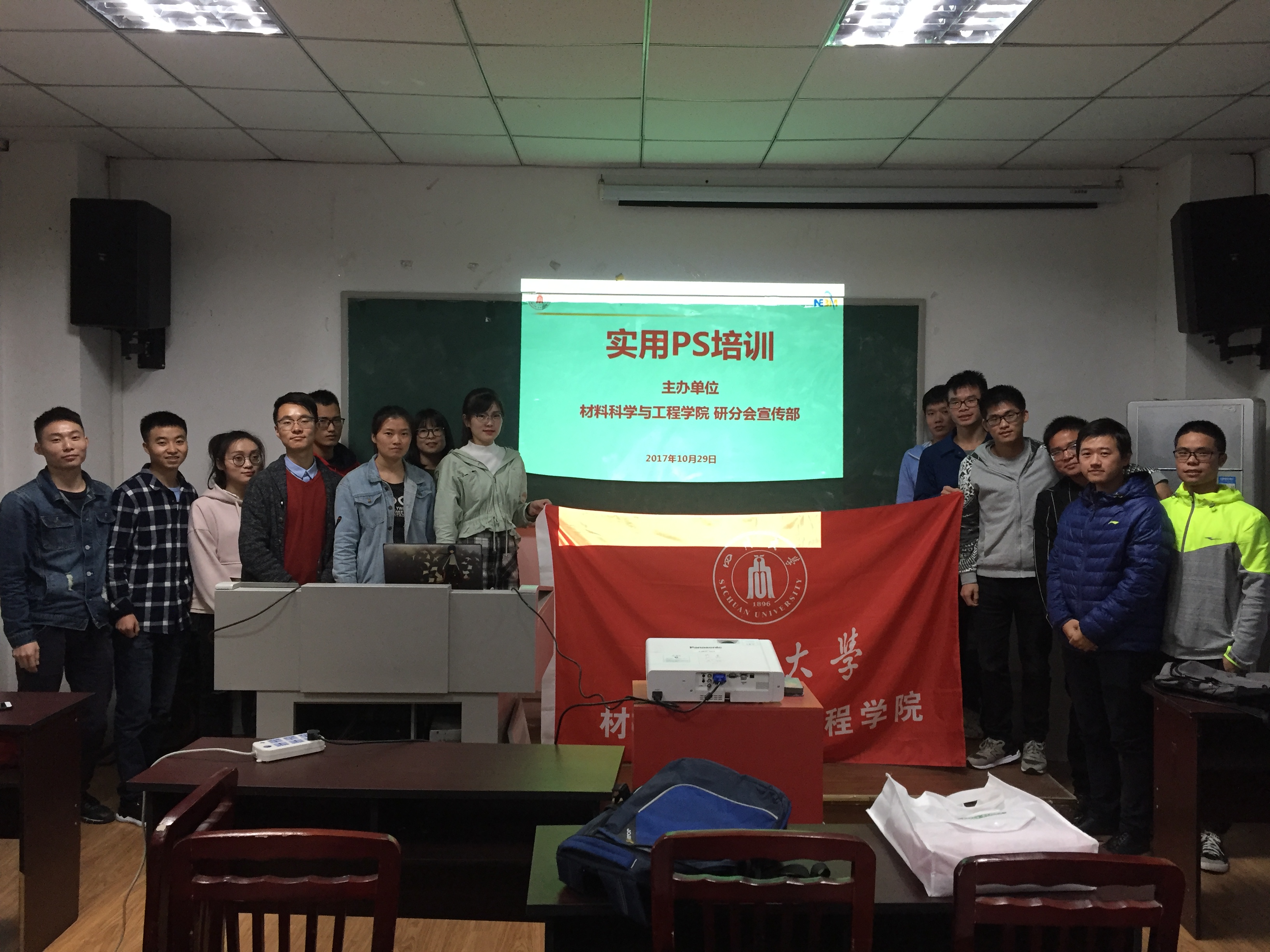 2017年10月29日晚19:00,材料科学与工程学院研究生分会宣传部举办的PS(Photoshop)应用软件技能培训会在四川大学第一理科楼209教室如期举行。材料学院2016级研分会宣传部部长唐小玲师姐应邀作为本次培训会的主讲人为大家介绍了PS的一些实用入门技能技巧,并为大家做了一系列的使用操作演练。