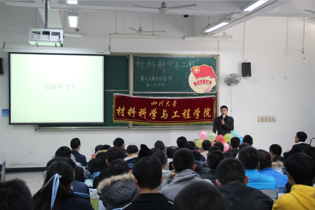 2017年12月10日星期日,材料科学与工程学院第十九届业余团校第二次行课在综合楼C座103教室正式举行,活动于下午两点开始。此次活动由材料科学与工程学院团委学生会主办,材料科学与工程学院团委学生会组织部承办。出席此次活动的嘉宾有材料科学与工程学院团委学生会执行团委副书记张爽同学、执行副主席李明宇同学、材料科学与工程学院团委学生会组织部执行部长王瑾同学、执行副部长蒋章堂同学以及三位研究生李万东同学、刘恩佐同学和苏思宇同学。