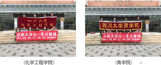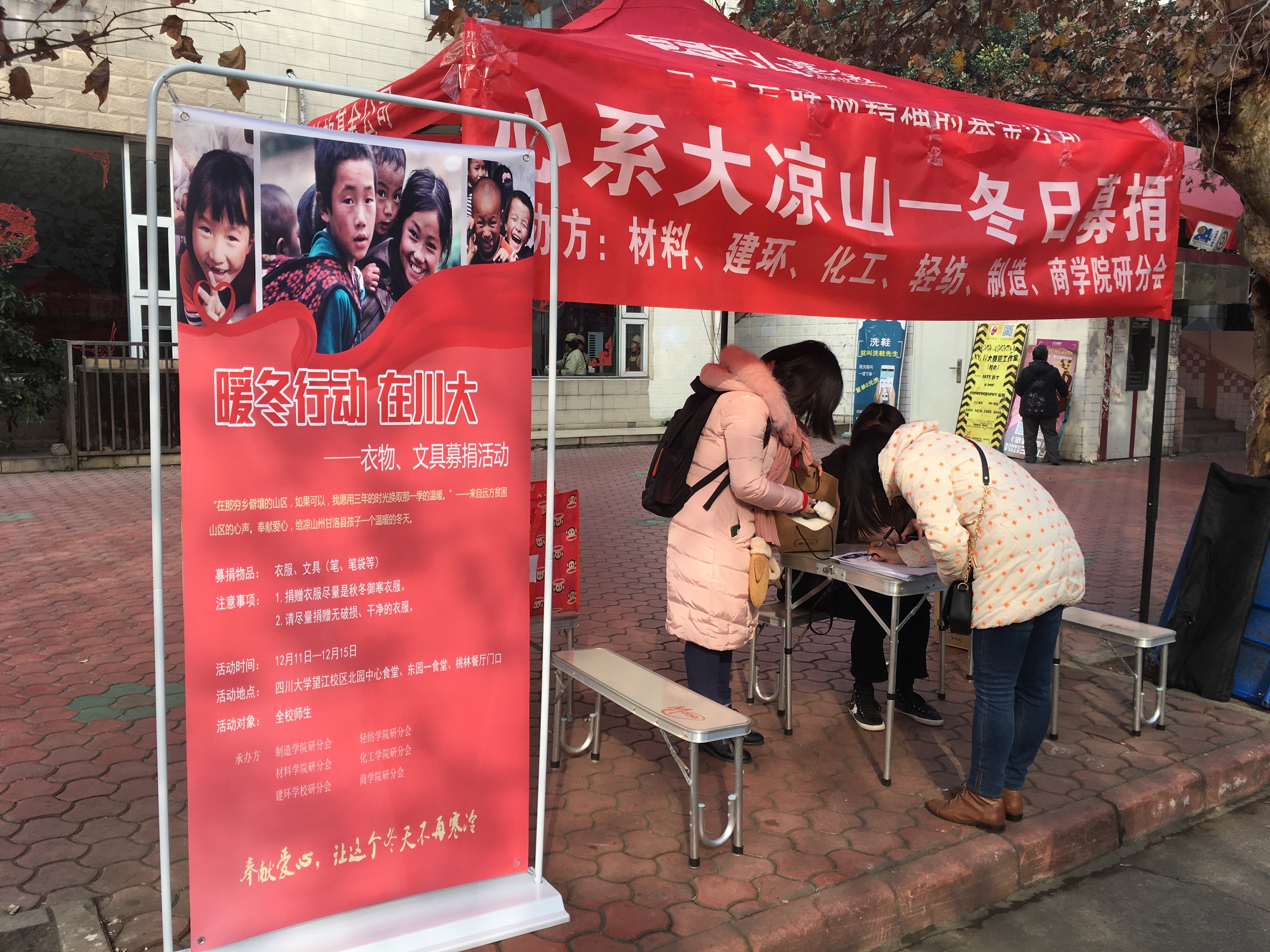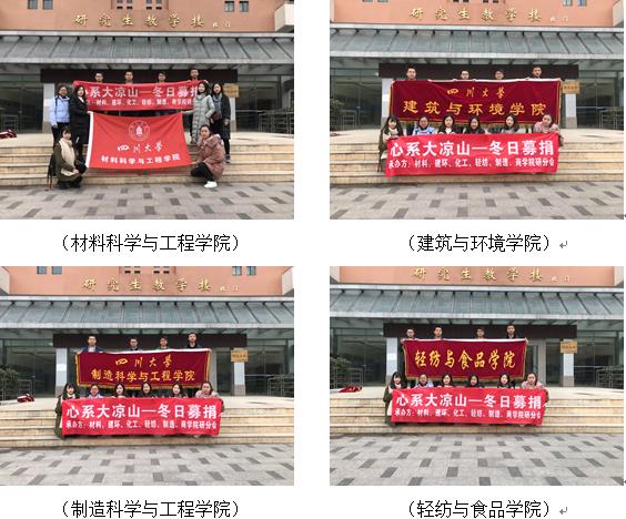 2017年12月11日至13日,由四川大学材料科学与工程学院、建筑与环境学院、制造科学与工程学院、轻纺与食品学院、化学工程学院和商学院六个学院研究生分会联合主办的“砥砺暖风行 心系大凉山”——四川大学爱心冬衣捐赠活动在四川大学望江校区北园中心食堂、东园一食堂、桃园餐厅门口三个捐赠点同时展开,本次活动的募捐物资包括冬衣、书籍、文具用品等,旨在帮助凉山州贫困学生及其家庭改善生活条件,为大凉山美姑县的孩子们开启一个有爱而温暖的冬季。