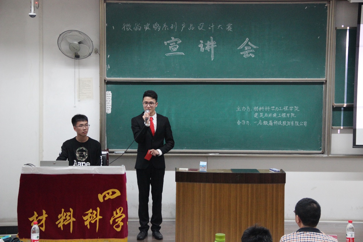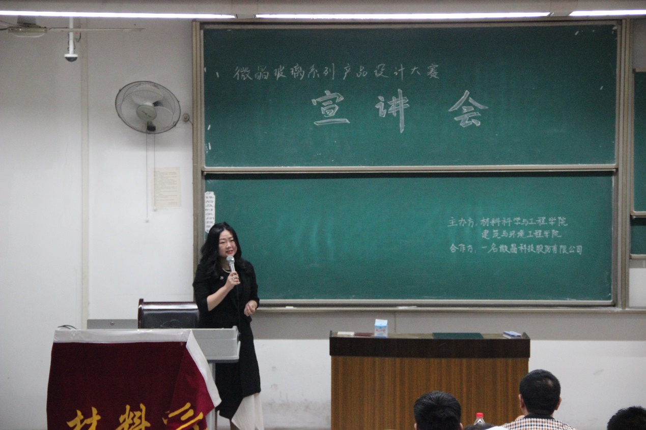 4月1日晚7时整,由四川大学材料科学与工程学院、建筑与环境工程学院主办,四川大学材料科学与工程学院团委学生会分科协、四川大学材料科学与工程学院多向陶瓷协会承办的微晶玻璃系列产品设计大赛宣讲会于江安校区第一教学楼B座305教室正式举办,到场的嘉宾有四川大学无机材料系和生物医学工程系主任芶立教授,一名微晶科技有限公司品牌部总监周小微,一名微晶科技有限公司设计师陈砚。