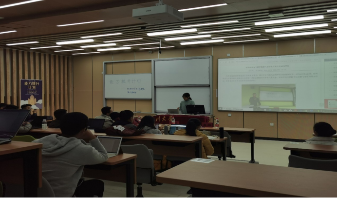 2019年11月23日19:00至21:00,材料科学与工程学院学生会能力提升部在江安综C105教室隆重举行学年能力提升培训会。本次活动到场嘉宾有:材料学院团委副书记李星进、团委副书记张鸿杰、学生会主席王晶、学生会副主席王一涵,参会人员为学院2019级各班班委及学生会部门干事。