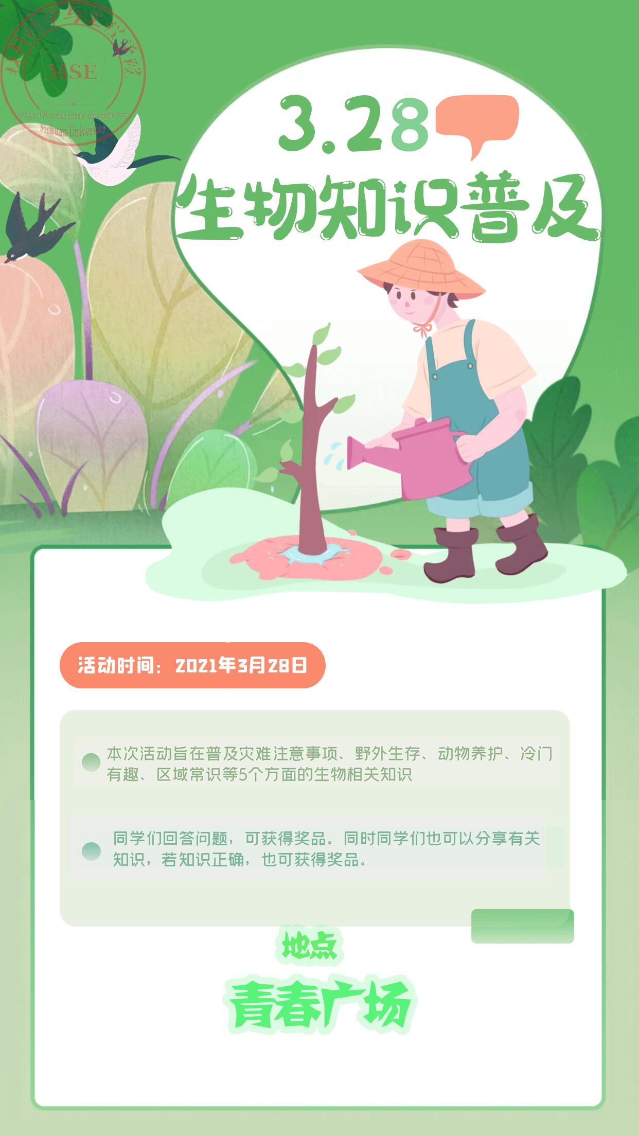 为了普及生物知识,掌握更多的生活常识和应急方法。材料科学与工程学院“生物知识普及活动”于3月28日在青春广场成功举办。本次活动由学院权益部主办,学院“源泉”青年志愿者协会协办。