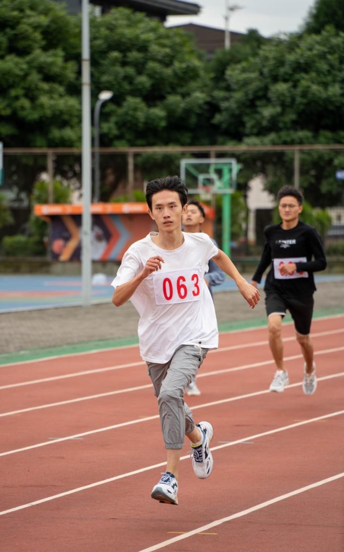 运动会正赛首先进行的是径赛。发令声,呐喊声,欢呼声在100米运动员们精彩的表现中将现场气氛推向高潮。随后进行的是男、女子各组4*100米,200米,400米,800米,1000米,短跑、中长跑项目。运动员们顽强拼搏,奋力向前。晶莹的汗水在同学们的面颊滑落,少年的眉宇间满是坚毅。接下来进行的是立定跳远,跳绳和实心球三项田赛。在立定跳远和实心球赛场上,运动员们在三次尝试中一次次挑战自我,超越自我。每每有战胜自己,超越自我的运动员,赛场上总不会缺少欢呼与喝彩。跳绳赛场上,运动员们迅速挥绳,专注起跳只为挑战自己的极限,展现更好的自我。各赛场上的裁判员们敬职敬责,确保大赛公平有序进行。