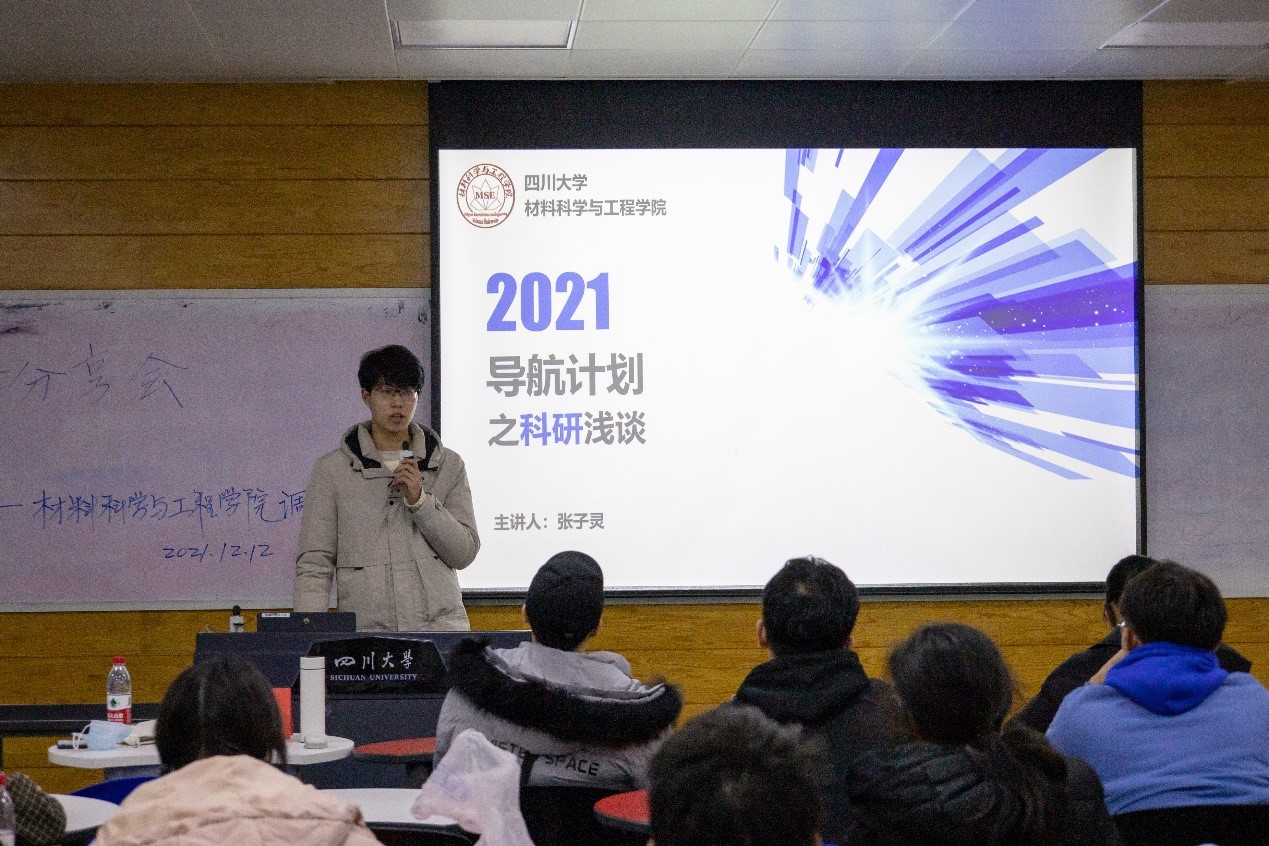 然后,张子灵同学为大家讲解科研相关事宜。作为一名新能源 专业的学生,他科研经历非常丰富,专业成绩名列前茅,保研至清华大学。他向在场的同学介绍了一些关于科研工作具体的事项,其中包括如何锁定心仪导师、确定研究方向后如何联系相关导师等相关问题。