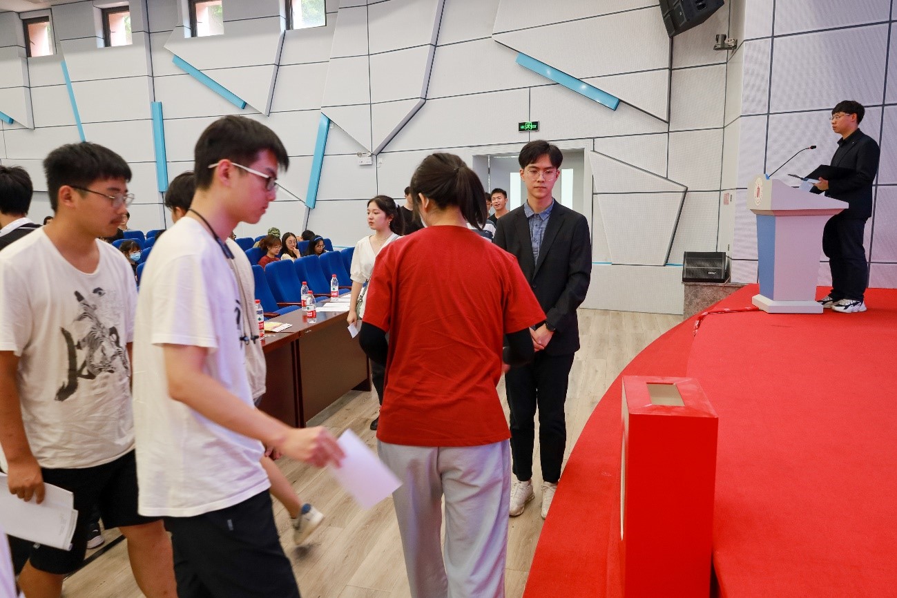 紧接着,大会进入了2022-2023年度主席团成员述聘环节。主席团候选人余晓沛、王欣语、张鼎炎依次登台进行竞选演讲,三位候选人分别简要介绍了自己的个人情况、工作经验和未来工作规划等内容。演讲结束后全体学生代表通过无记名投票方式进行民主选举,经统计产生了学院2022-2023年度主席团成员,余晓沛当选学生会主席,王欣语和张鼎炎当选学生会副主席。随后,第十届学生会主席雷博睿将我院学生会会旗递交给新一届主席团成员,完成了会旗交接。